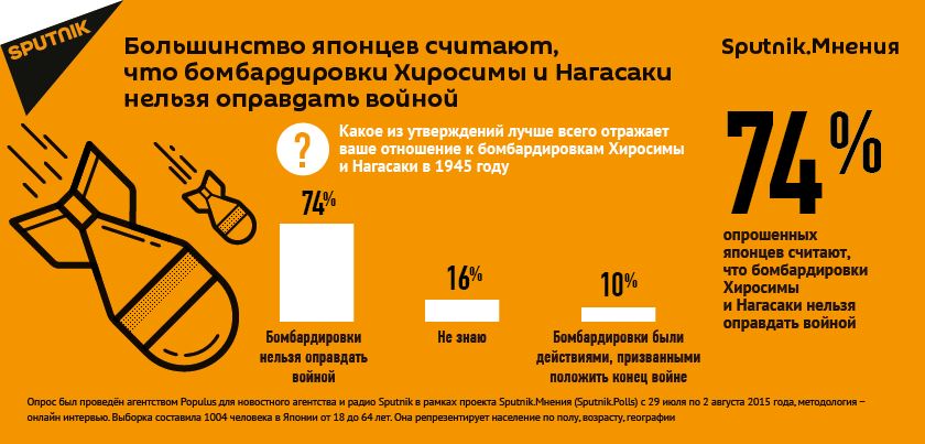 Японцы ждут извинений от США за бомбардировку Хиросимы и Нагасаки. По данным нового опроса «Sputnik.Мнения», проведенного в Японии компанией Populusдля международного информационного агентства и радио Sputnik, большинство опрошенных японцев (61%) считают, что США должны извиниться за бомбардировки Хиросимы и Нагасаки, а 74% респондентов полагают, что эти бомбардировки нельзя оправдать войной, так как погибло много гражданского населения.