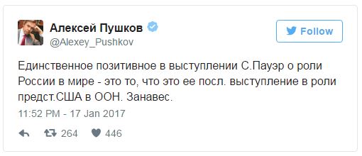 Также г-жа Пауэр прошлась по российским хакерам, вмешательству в выборы – словом, по всему тому, что мы слышим и видим с момента начала украинского кризиса. Ну и ладно. Единственный позитивный момент этого выступления отметил в своём твиттере член Совета Федерации и председатель Комиссии Совфеда по информационной политике А. К. Пушков: