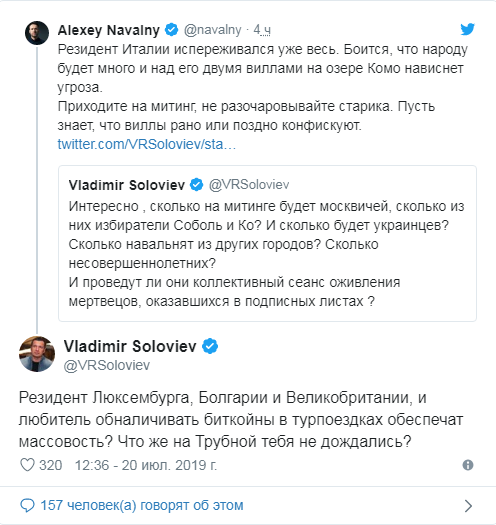 В ответ Владимир Соловьев спросил у Навального, почему его так и не дождались на митинге на Трубной площади. Также журналист поинтересовался у блогера, который является финансовым резидентом Люксембурга, Болгарии и Великобритании, помогут ли обеспечить массовость данного мероприятия снятые им за границей биткойны.